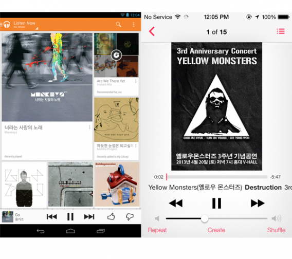 Het is niet helemaal eerlijk om Google Play Music All Access en iTunes Radio te vergelijken omdat ze twee verschillende dingen doen, maar de muziekspelers van Android en iOS vergelijken is wel mogelijk. Google Play Music moet het hebben van streaming muziek, waarbij je losse nummers kan downloaden om ze offline te luisteren. iTunes is traditioneler en dient als muziekbibliotheek voor je mp3’s en aankopen.
