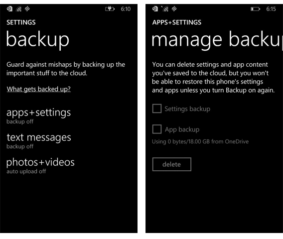 In Windows Phone is het mogelijk om cloud back-ups te activeren voor apps, foto’s en tekstberichten. De opslagruimte bedraagt 18 gigabyte en het systeem maakt regelmatig een reservekopie zodat je dat niet handmatig hoeft te doen. Je back-ups beheer je rechtstreeks vanaf je telefoon.