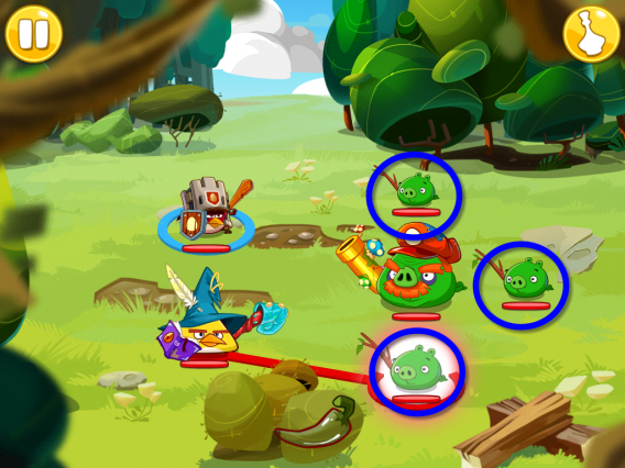 Ga dus eerst voor de kleine biggen. Die zijn sneller te verslaan en vallen je vervolgens niet meer lastig, zodat de tegenstander minder beurten krijgt om aan te vallen. Vervolgens richt jij al je krachten op het grote varken, terwijl je een stuk minder schade oploopt.