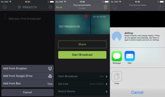 Hoe werkt Preso.tv precies? Het eerste wat je moet doen is je PowerPoint-, PDF- of Word-presentatie uploaden naar de cloud. Preso.tv ondersteunt Dropbox, Google Drive en Box. Vervolgens selecteer je de presentatie in de app, waarna Preso.tv het unieke webadres aanmaakt. Nu open je het webadres (of start je de presentatie via AirDrop) en ben je klaar om van start te gaan. Leuke extra: je gebruikt je iPhone of iPad als afstandsbediening om zo eenvoudig naar de volgende dia te gaan.