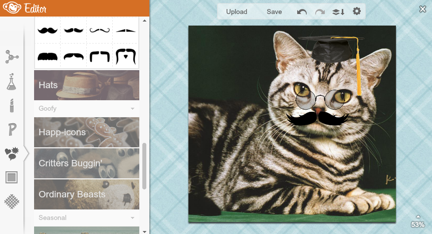 Naast tekst voeg je met gemak bloemen, vlinders en andere toestanden toe aan een foto. Vooral de accessoires zijn leuk en PicMonkey heeft een regenboog aan hoeden, brillen en snorren voor je. Wil je een foto voorzien van een tekstballonnetje dan zijn er talloze beschikbaar via een speciaal menu. Net als bij filters en andere functies van PicMonkey zijn accessoires gemakkelijk aan te passen (in grootte en kleur) via de menu’s die verschijnen na het aanklikken ervan.