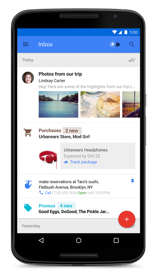 Inbox is als het ware een mix tussen Gmail en Google Now en helpt je met notificaties en notities de dag beter in te delen.