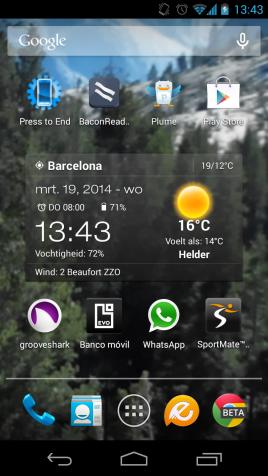 Het eerste wat opvalt aan mijn startscherm is de hoeveelheid ruimte die de Weer & Klok Widget inneemt. Zonde, zou je zeggen maar au contraire. In de drie maanden in het jaar dat het niet zonnig en warm is in Barcelona zie ik graag snel wat ik kan verwachten zodra ik de deur uitga. Dat is nog niet alles; de schat aan informatie die deze widget geeft is enorm. Met 1 druk op de app ga ik trouwens direct naar mijn klok, alarm of agenda. Multifunctioneel dus.