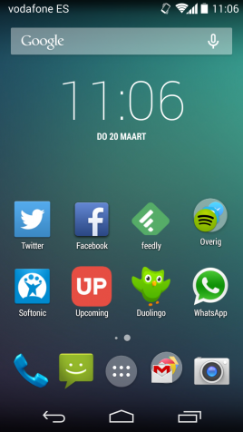 Tot slot, ik werk voor/dankzij/met het internet. Ik schrijf veel over games en om van alle nieuwtjes in de gameswereld op de hoogte te blijven gebruik ik BaconReader voor Reddit en Plume voor Twitter. Zo heb ik alle scoops direct op mijn mobiel dankzij deze 2 apps op mijn startscherm. Mocht het nieuws over een Android-game betreffen, dan heb ik gelijk de Play Store binnen handbereik. Mijn startscherm houdt dus rekening met mijn wensen in de privésfeer als ook met mijn benodigdheden voor werk. Oh ja, af en toe verstuur ik ook een berichtje via WhatsApp, ondanks dat Facebook het gekocht heeft.
