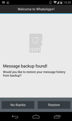 Merk op dat WhatsApp Plus, net als WhatsApp, vraagt of je de opgeslagen back-up van je chats wilt openen. Bevestig.