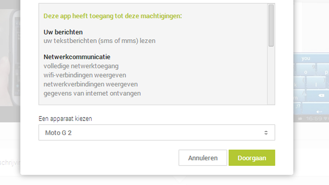 In het pop up-scherm ga je akkoord met de voorwaarden en kies je het Android-apparaat dat aan je account is gekoppeld, in dit geval de Motorola Moto G.