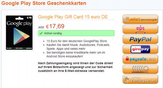 Google verkoopt, zoals gezegd, geen Play Store-cadeaubonnen in Nederland en België. In Duitsland is dat wel het geval, dus via Duitse webwinkels koop je een Google-giftcard met je PayPal-account.